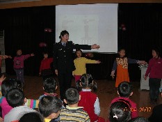 最后,叔叔、阿姨和小朋友玩起了“我来做交通警察”的游戏。小朋友和交警的叔叔、阿姨共同渡过了和谐、乐快的一天。